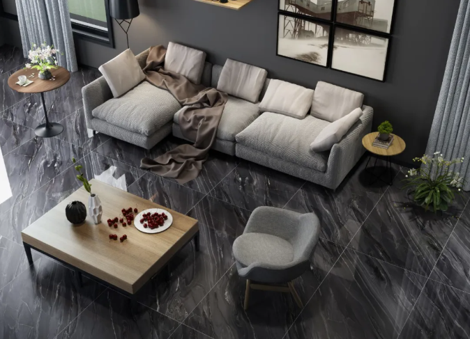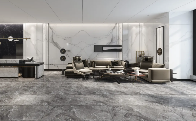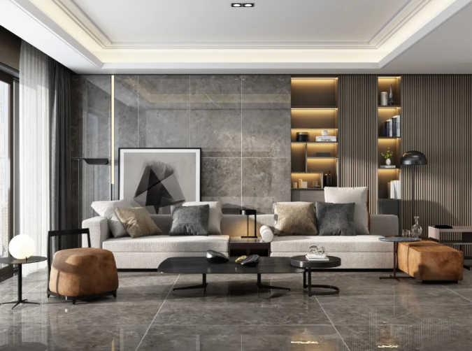 以盧卡深灰作地面鋪貼,灰色作為主色調,黑、白等顏色為輔助色彩,空間既不會因灰色而顯得深沉,也不會過于艷麗,卻能讓人一眼便能分辨主次。金屬質感的燈具、茶幾點綴其中,愜意、舒適、自然的氣息充滿整個空間,令一石多面紋理更加連貫、氣派,給空間帶來前所未有的時尚趣味。