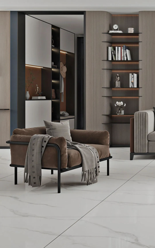 冰河白作為主調(diào)的空間,不禁讓人幻想起極其純凈的山河冰川。設(shè)計師帶著對自然風(fēng)光的憧憬,將行云流水般的石紋糅合在瓷磚的表面上,展現(xiàn)出如夢似幻的地貌特色,帶來非凡體驗。