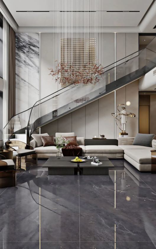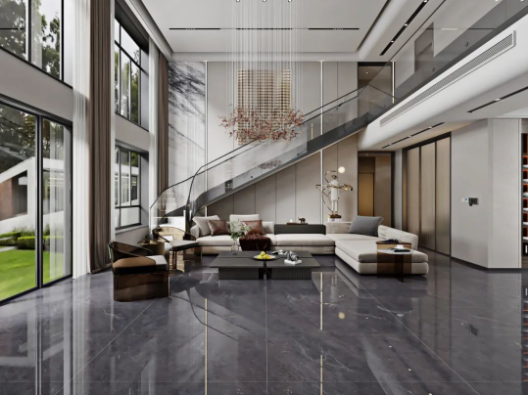 客廳采用挑高設(shè)計,不僅能增強(qiáng)室內(nèi)采光效果,同時突出空間錯落有致的層次感,讓客廳高級感瞬間拉滿,加上斯克深灰獨(dú)一無二的紋理,無論檔次、質(zhì)感、氣場,都透露著別具一格的藝術(shù)氛圍。