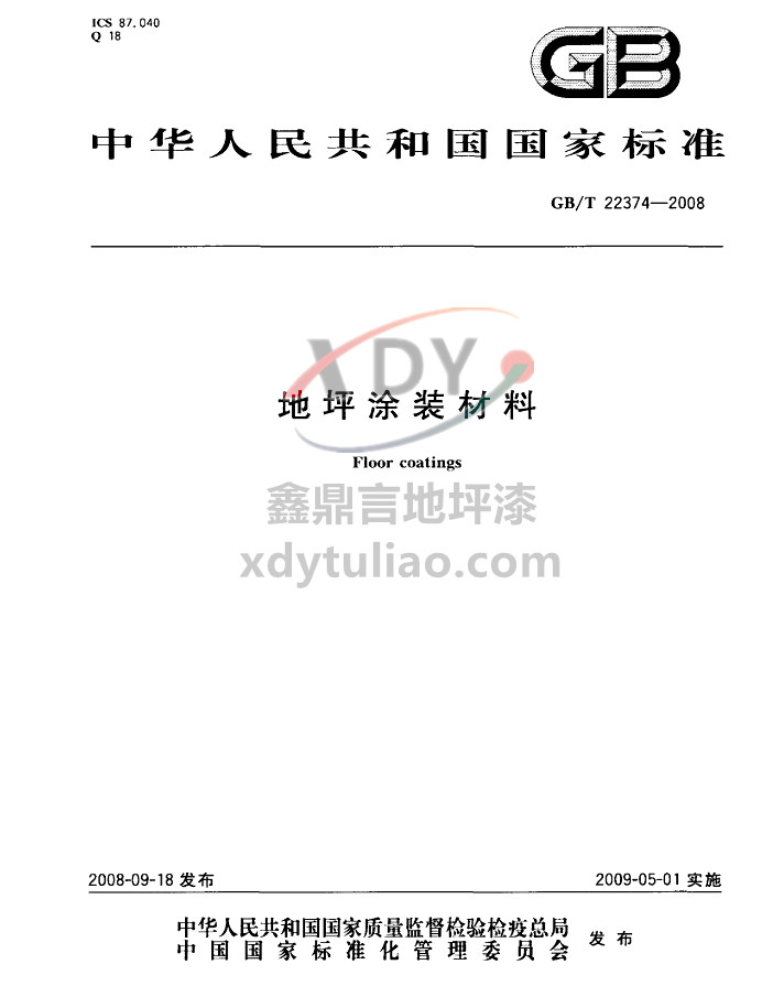 GB/T 22374-2008地坪涂裝材料國(guó)家標(biāo)準(zhǔn) 中華人民共和國(guó)國(guó)家標(biāo)準(zhǔn) GB/T 22374-2008 地坪涂裝材料Floor coatings 2008-09-18發(fā)行 2009-05-01實(shí)施 中華人民共和國(guó)國(guó)家質(zhì)量監(jiān)督檢驗(yàn)檢疫總局 中國(guó)國(guó)家標(biāo)準(zhǔn)化管理委員會(huì) 發(fā)布 本標(biāo)準(zhǔn)規(guī)定了合成樹脂基地坪涂裝材料的術(shù)語(yǔ)和定義、產(chǎn)品分類、有害物質(zhì)限量及物理性能要求、試驗(yàn)方法、檢驗(yàn)規(guī)則、標(biāo)志、包裝、運(yùn)輸與貯