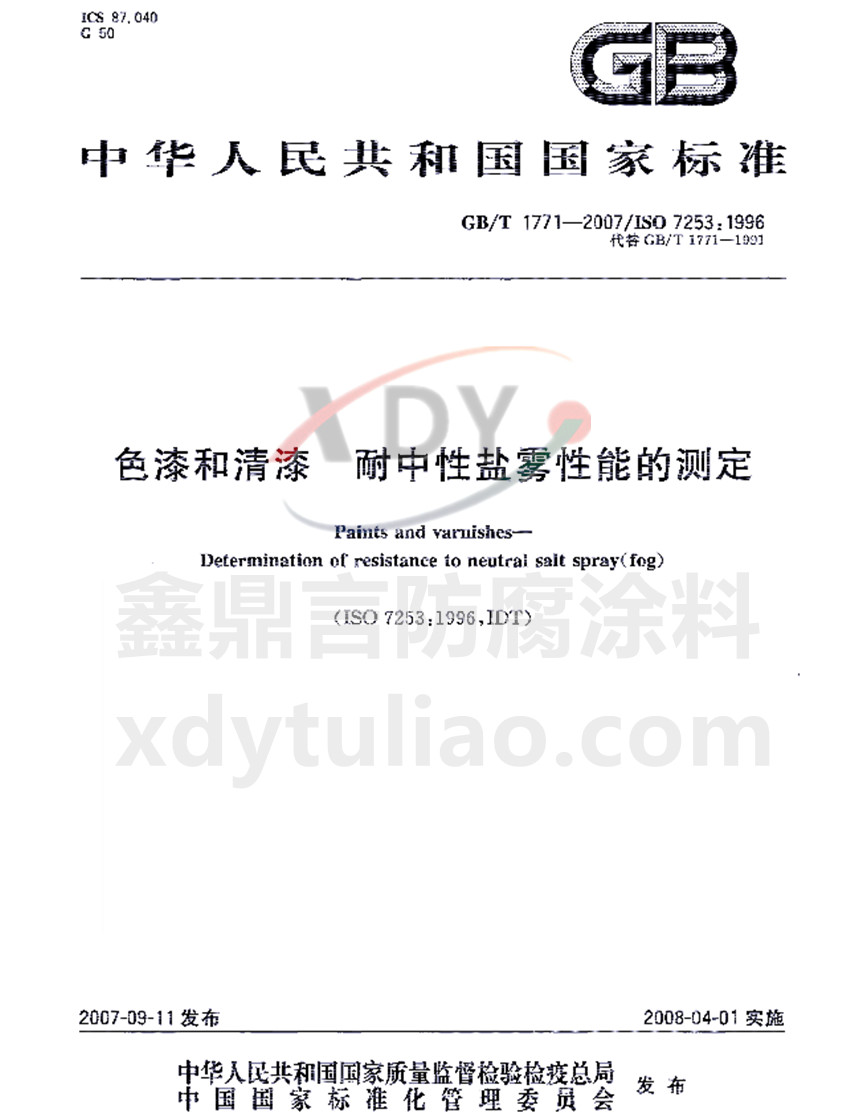 GB/T1771-2007色漆和清漆 耐中性鹽霧性能的測(cè)定標(biāo)準(zhǔn)是鑫鼎言防腐涂料照搬GB/T1771-2007《色漆和清漆 耐中性鹽霧性能的測(cè)定》紙質(zhì)版內(nèi)容。大家可以放心參考。 ICS 87.040 G50 GB 中華人民共和國(guó)國(guó)家標(biāo)準(zhǔn) GB/T1771-2007/ISO 7253:1996代替GB/T1771-1991 色漆和清漆 耐中性鹽霧性能的測(cè)定Paints and var