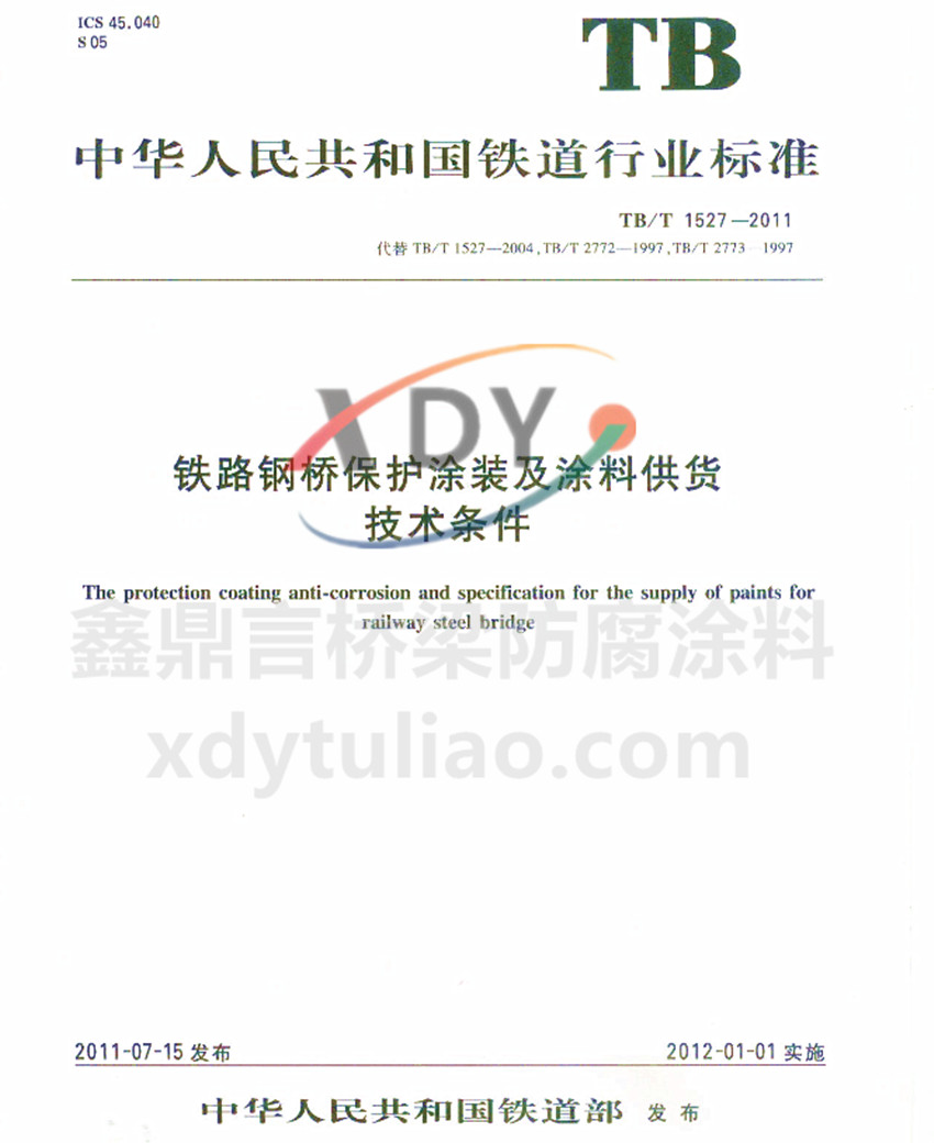 TB/T 1527-2011鐵路鋼橋保護涂裝及涂料供貨技術條件 華人民共和國鐵道行業(yè)標準 TB/T 1527-2011代替TB/T 1527-2004、TB/T 2772-1997、TB/T 2773-1997 鐵路鋼橋保護涂裝及涂料供貨技術條件 The protection coating anti-corrosion and specification for the supply of pa